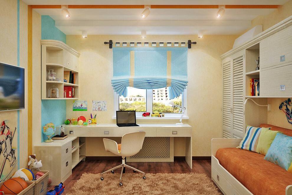 Удачный вариант для небольшой площади – задействовать часть подоконника под рабочий стол. Выбирая такую идею, продумайте оформление окна, ведь текстиль не должен мешать ребенку во время занятий. Стену возле окна можно заполнить полками и выдвижными ящиками, сделав в этой части место хранения.