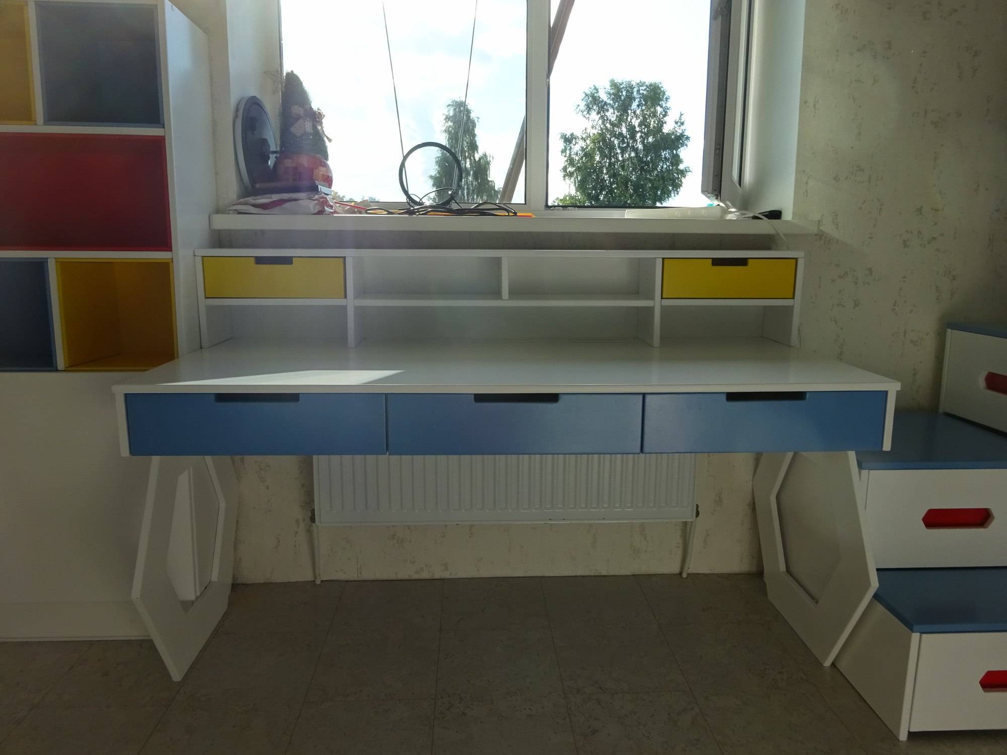 На рабочем столе необходимо учесть место для компьютера, а также полноценное свободное пространство для выполнения домашних заданий. Модель дивана или кровати лучше выбрать со специальными выдвижными ящиками для хранения.