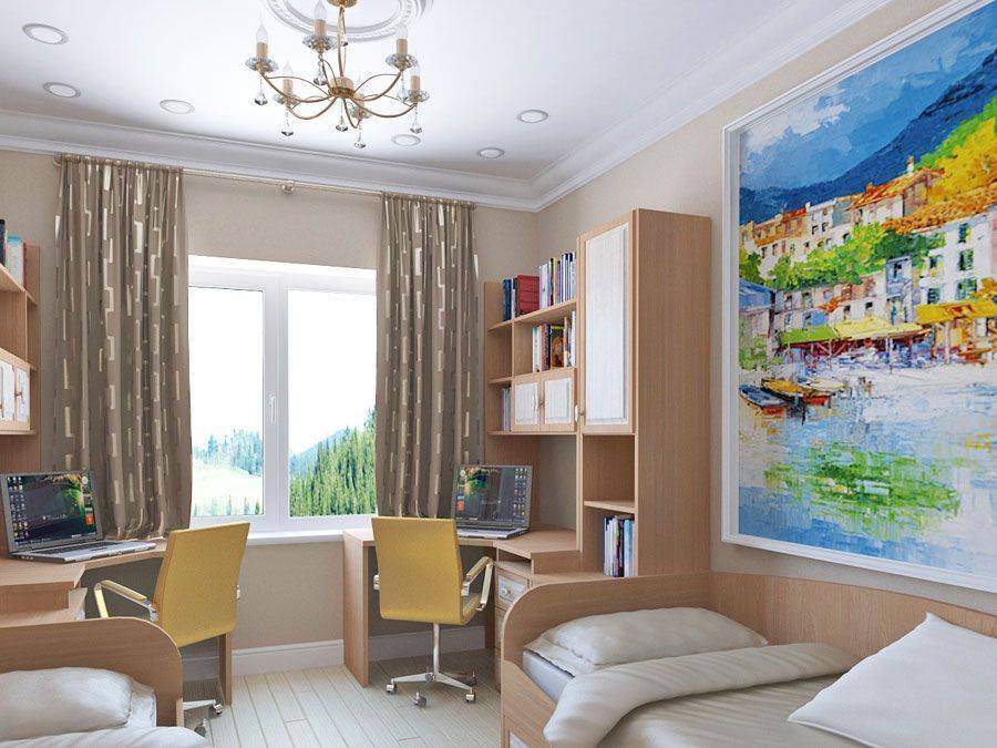 Основная трудность заключается только в оптимизации пространства, так как необходимо разместить две кровати, две учебные зоны. Если в комнате будут жить дети с разными увлечениями, разного возраста или пола, то нужно позаботиться и о двух игровых зонах.