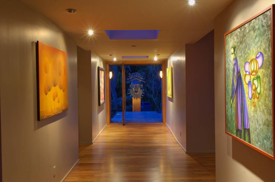 Стены коридоров нередко используют для экспозиции авторских фотографий, домашней картинной галереи или семейных фото. Если у хозяев есть хобби, касающееся путешествий и коллекционирования, то коридор могут украсить стеклянные витрины с экспонатами – моделями автомобилей, редкими бабочками и экзотическими насекомыми, этнической керамикой и др.