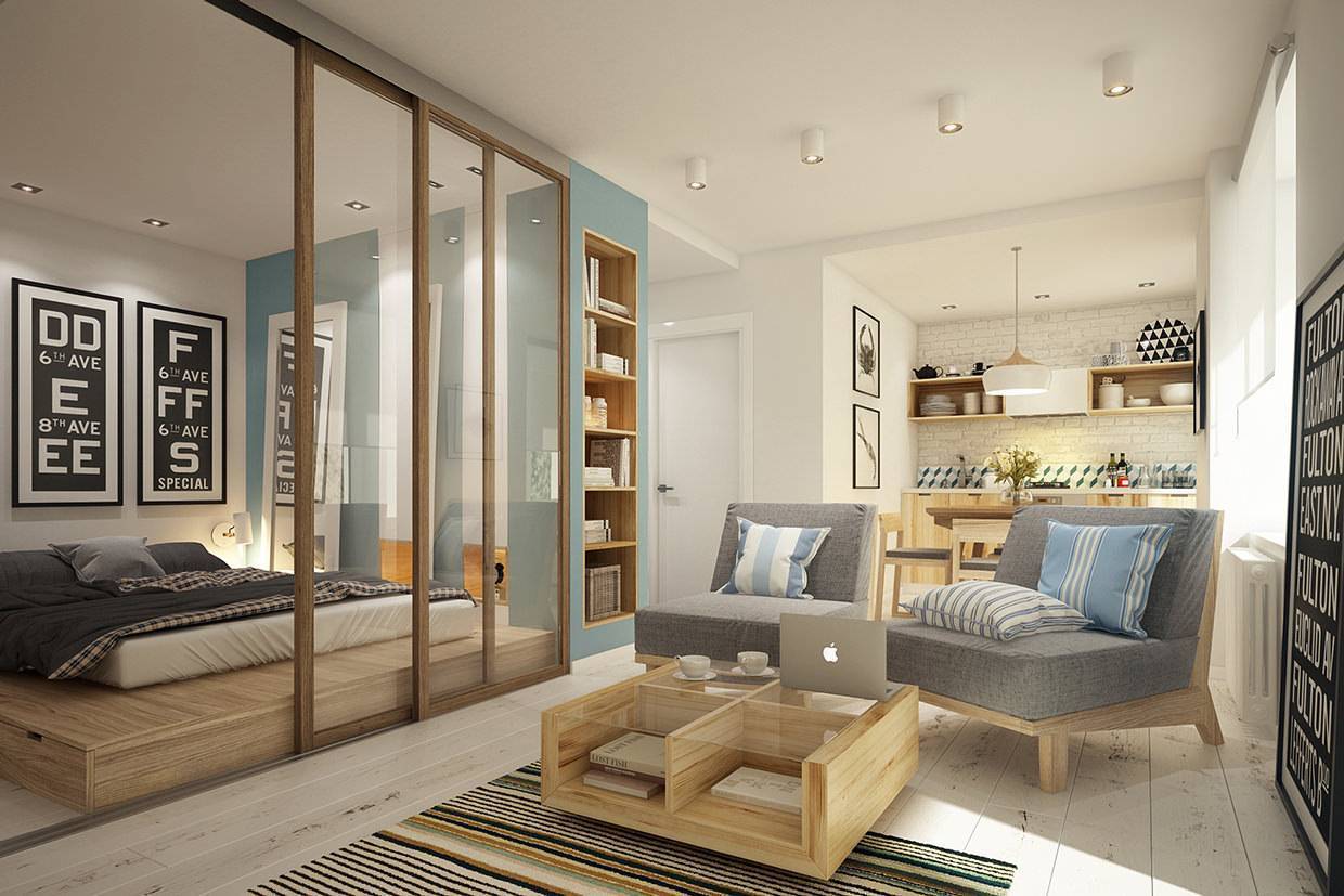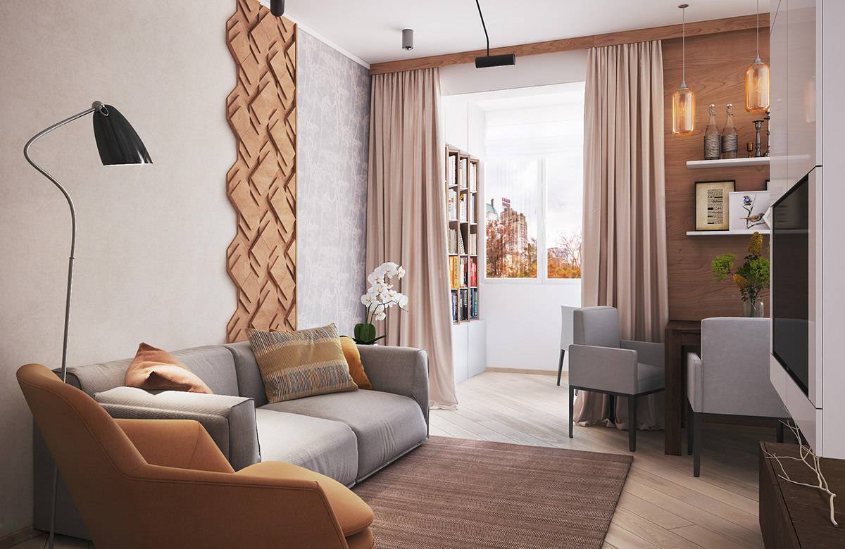 В проектировке квартиры 40 кв., гостиная может представлять собой часть кухни и быть отделенной с помощью перегородки, барной стойки или являться отдельной полноценной комнатой с диваном, телевизором, аудиосистемой, креслами, пуфами и прочим.