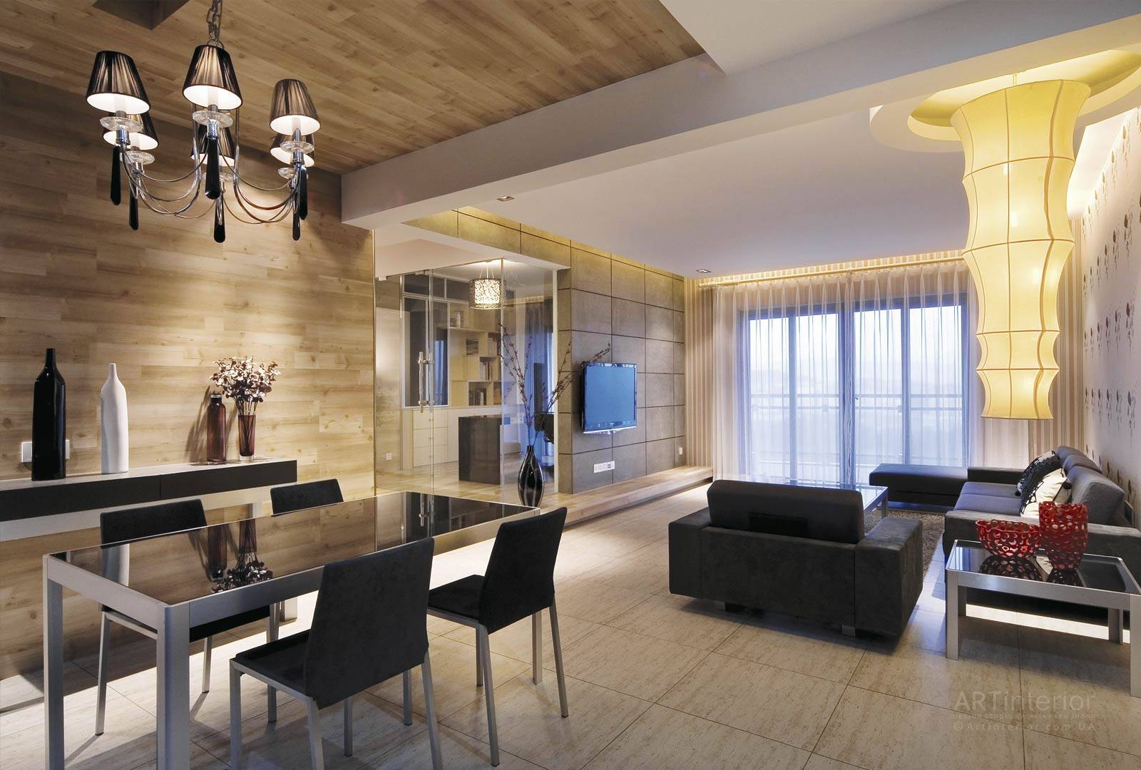 При отделке гостиной с домашним кинотеатром можно использовать натуральное дерево и дорогой текстиль