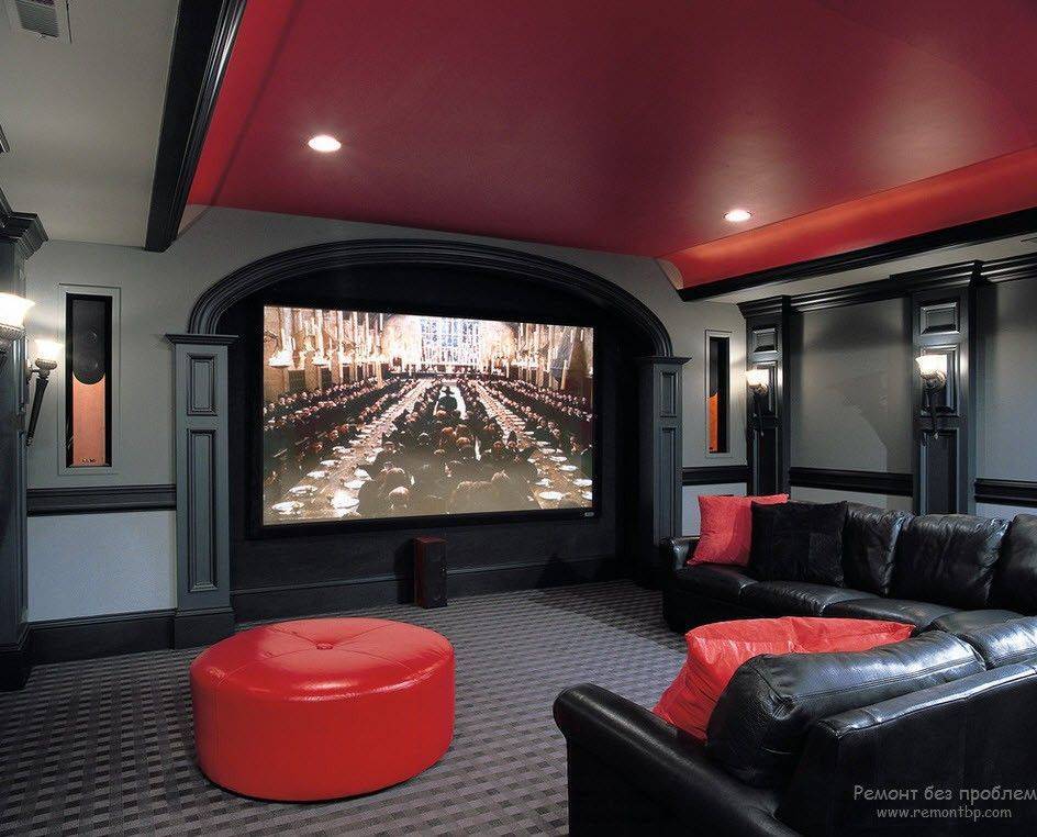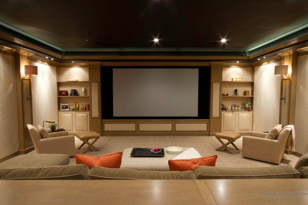 После приобретения аппаратуры для просмотра фильмов на большом домашнем экране владельцам жилья необходимо подобрать и обустроить место для будущего киноуголка. Индивидуальный интерьер домашнего кинотеатра разрабатывается с учетом размеров и местоположения помещения: