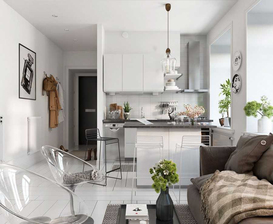 Совмещение кухни с жилой комнатой. Это позволит создать просторную гостиную, выполненную в виде студии, и заполнить интерьер для двухкомнатной квартиры всем необходимым. Перегородку можно убрать полностью или оставить и использовать для создания различных архитектурных форм. Разделение на зоны кухни, столовой и гостиной в виде мобильных перегородок позволят увеличивать пространство под определенные задачи там, где это действительно необходимо. Применение плавных линий в подвесных потолках или разных уровнях пола смогут создать ошеломляющий эффект, а дизайн интерьера двухкомнатной квартиры — неповторимым.