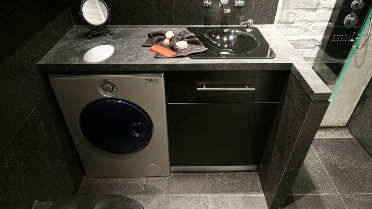 В этой ванной владельцы отказались от ванны в пользу красивой душевой кабины с напольной раковиной. При этом стиральная машина встроена в тумбу возле мойки, над ней удобная каменная столешница для полотенец и аксессуаров.