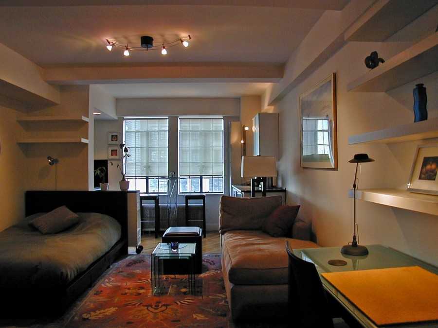 Квартира-студия — это удачное решение для молодых пар. В одном пространстве можно объединить зал с кухней или спальней, или все три помещения вместе. Рекомендуется оставлять отдельную комнату, чтобы в дальнейшем там жили дети. Приоритет для пары в двухкомнатной квартире — пространство. Не нужно обставлять комнаты лишней мебелью. Нет необходимости оставлять прихожую или увеличивать кухню. В квартире должен быть уголок с интимной обстановкой: легким освещением, расслабляющей цветовой гаммой, соответствующим декорированием