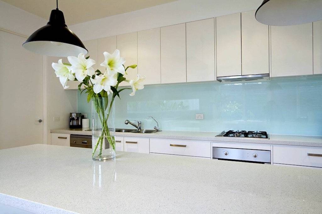 Здесь будет важно подобрать нужный оттенок, так как именно от него будет зависеть результат. Белый цвет фартука будет отлично сочетаться с темной столешницей, при этом делая помещение светлее и просторней