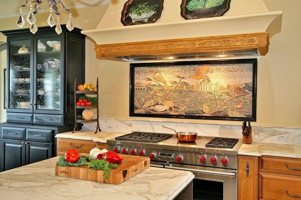 Совет! В зоне готовки в целях сохранения безупречного внешнего вида картин из кафеля нужно выбрать место на стене, удаленное от источников воды и огня (мойки и варочной поверхности). В ином случае нужно выбрать монолитное панно без швов или сделанное из ректифицированной плитки.