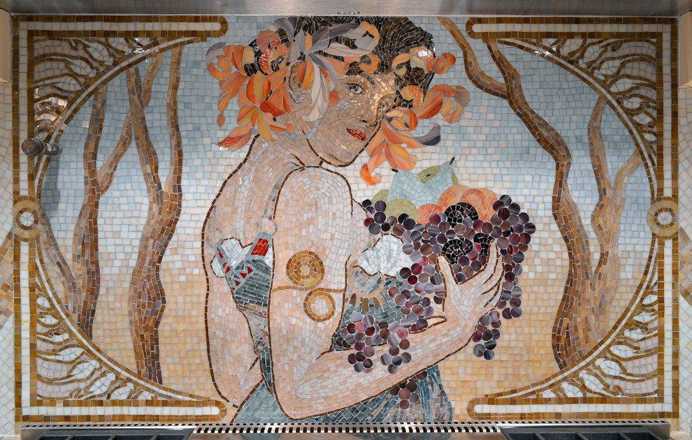 Интерпретация «Фруктов» Альфонса Мухи – притягивающий взглядыцентр интерьерной композиции на кухне (см. предыдущее фото). Это эксклюзивная мозаика, выполненная на заказ