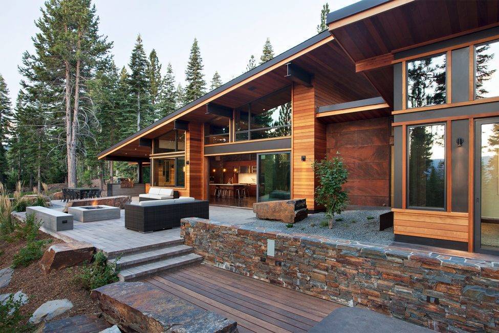 Облицовка фасадов традиционно выполняется камнем и деревом, причем дорогостоящий натуральный материал может быть заменен искусственным аналогом, который ни в чем не уступает ему ни в эстетичности, ни в практичности. Дома с таким декором будут очень гармонично выглядеть на фоне леса или гор.