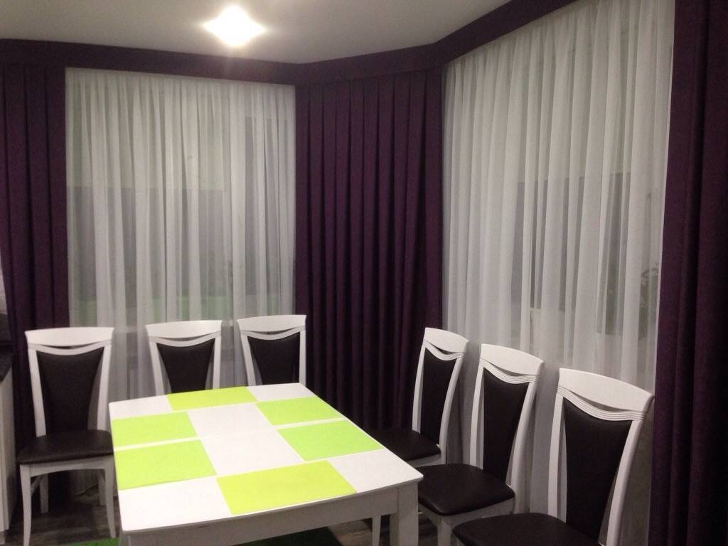 - шторы могут изменить характер фиолетовой кухни: сочетание белый-фиолетовый придаст романтический оттенок; серый-фиолетовый сделает акцент на стиль техно или сдержанный минимализм, салатовый-фиолетовый добавит мягкости;