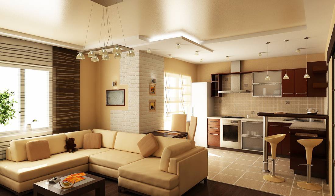 Можно установить потолочную люстру, добавить к ней точечное освещение по периметру. Установи торшер или бра в зоне отдыха, над барной стойкой красиво смотрятся подвесные светильники.