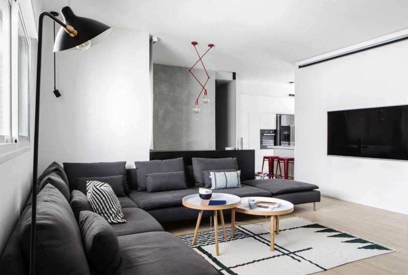 Контрастный интерьер, простые прямые линии, небольшое количество мебели, ненавязчивый и нескучный декор.
