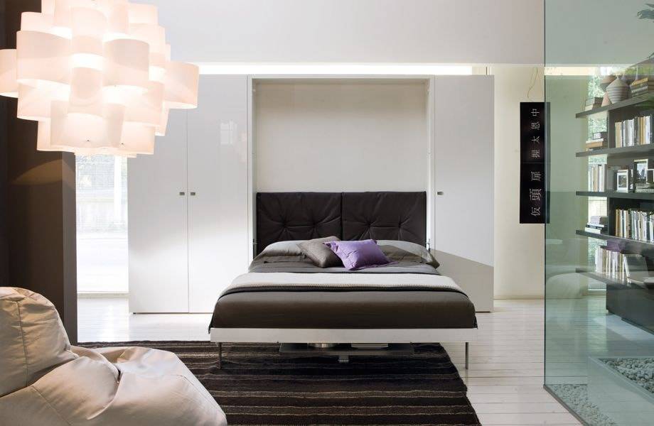 - убираем, насколько это возможно, шкафы, тумбы и стол, используем для этого встроенные и разборные модели;