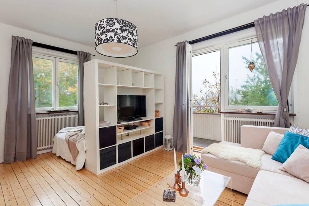 - Для кровати можно специально обустроить нишу, например, выстроив перегородку у входа. Образуется небольшой коридорчик, в котором можно организовать шкаф-купе и другие места для хранения. Гостевая зона будет, конечно, чуть меньше желаемого – примерно 2 на 3,8 м, но получится два отдельных функциональных участка.