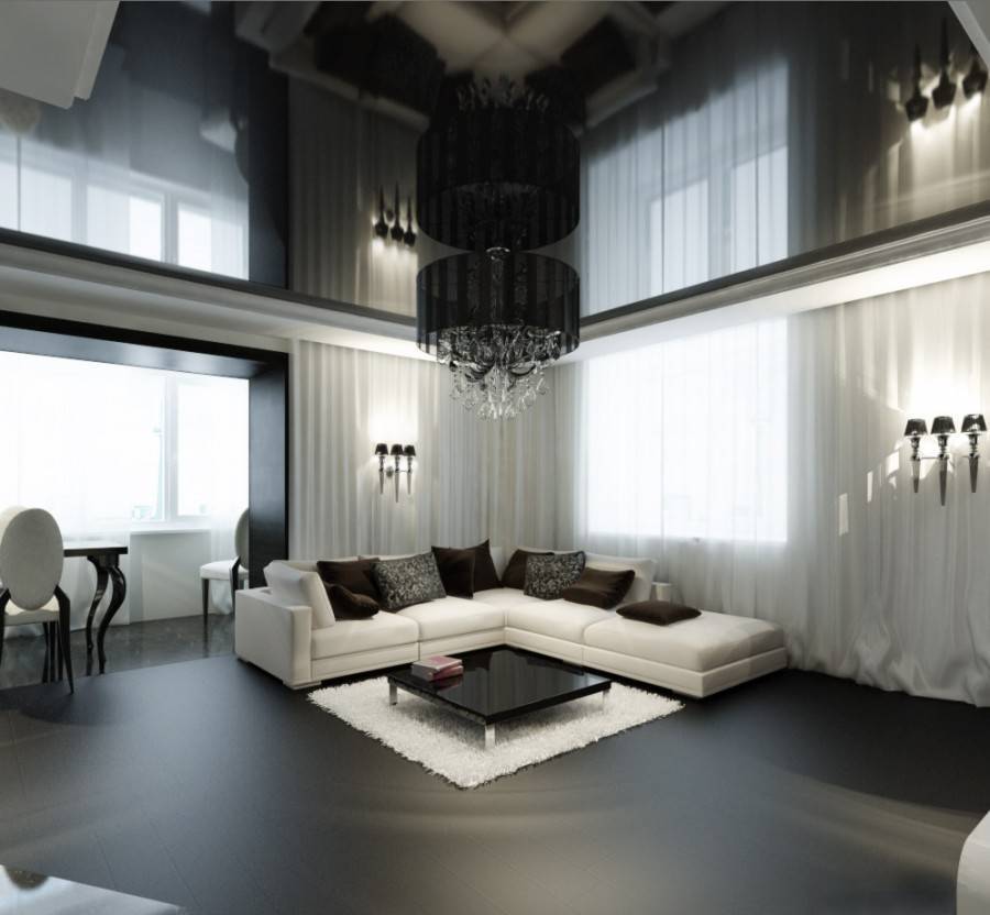 Сочетание белого и черного гостиной в интерьере гостиной выглядит современно
