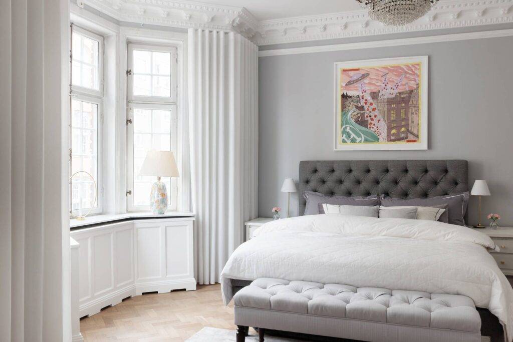 Первый вариант подойдет людям, чья цель состоит в том, чтобы эркер слегка выступал из пространства и максимально освещал интерьер. Одинаковые цвета красок, использованные для всех частей помещения, сделают эркер его неотъемлемым, равноправным элементом.