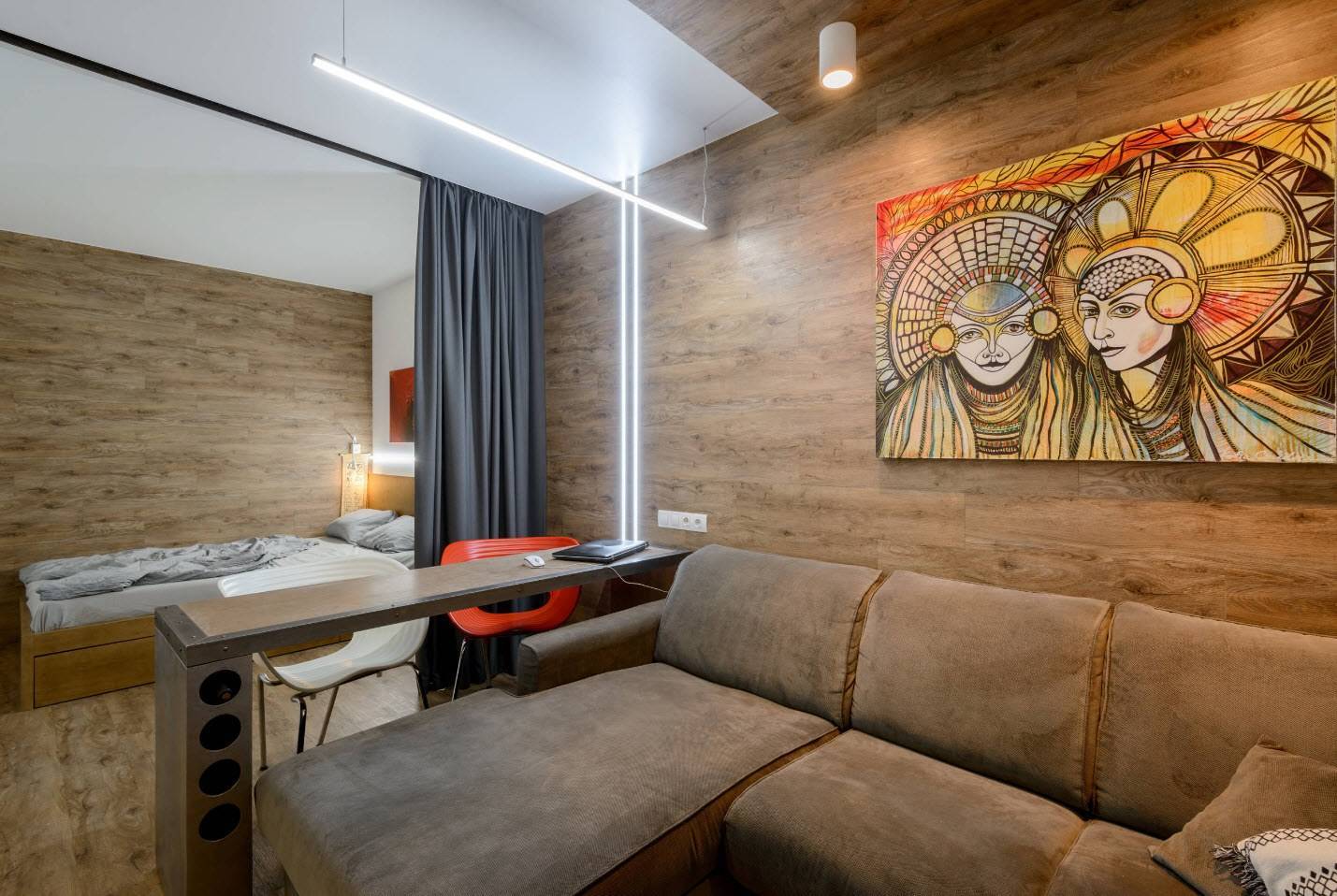 Интересный проект спальни-гостиной с отделкой под дерево