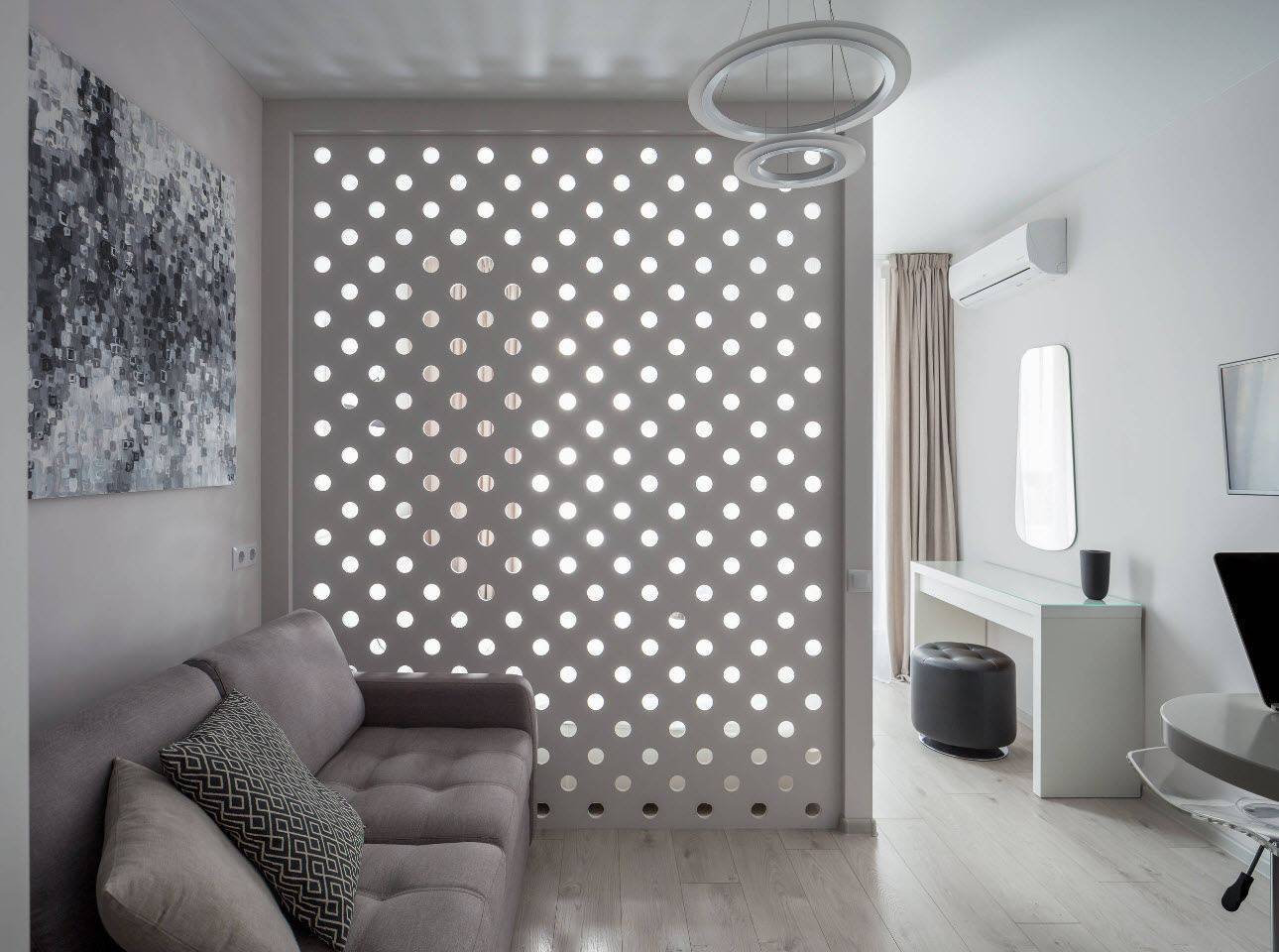 - Совсем маленькое помещение (менее 13 м2) не стоит разделять таким образом. При раздроблении на более маленькие зоны есть риск еще больше визуально сжать границы.