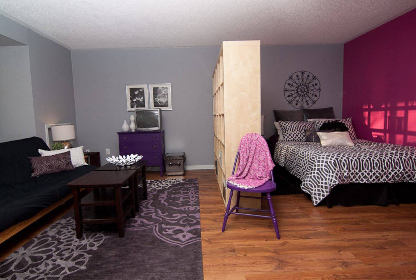 В таком случае стараются оставлять по 1 проему в гостевой и спальной зонах. Если комната велика (площадью минимум 18 кв. м), обычно применяются гипсокартонные перегородки. Они отличаются легкостью и прочностью, при этом довольно хорошо сдерживают посторонние шумы. Когда места очень мало, или же еще почему-то невозможно смонтировать серьезные конструкции, для зонирования применяют цветовой контраст. Его можно задать при помощи краски, обоев либо фактурных штукатурок.
