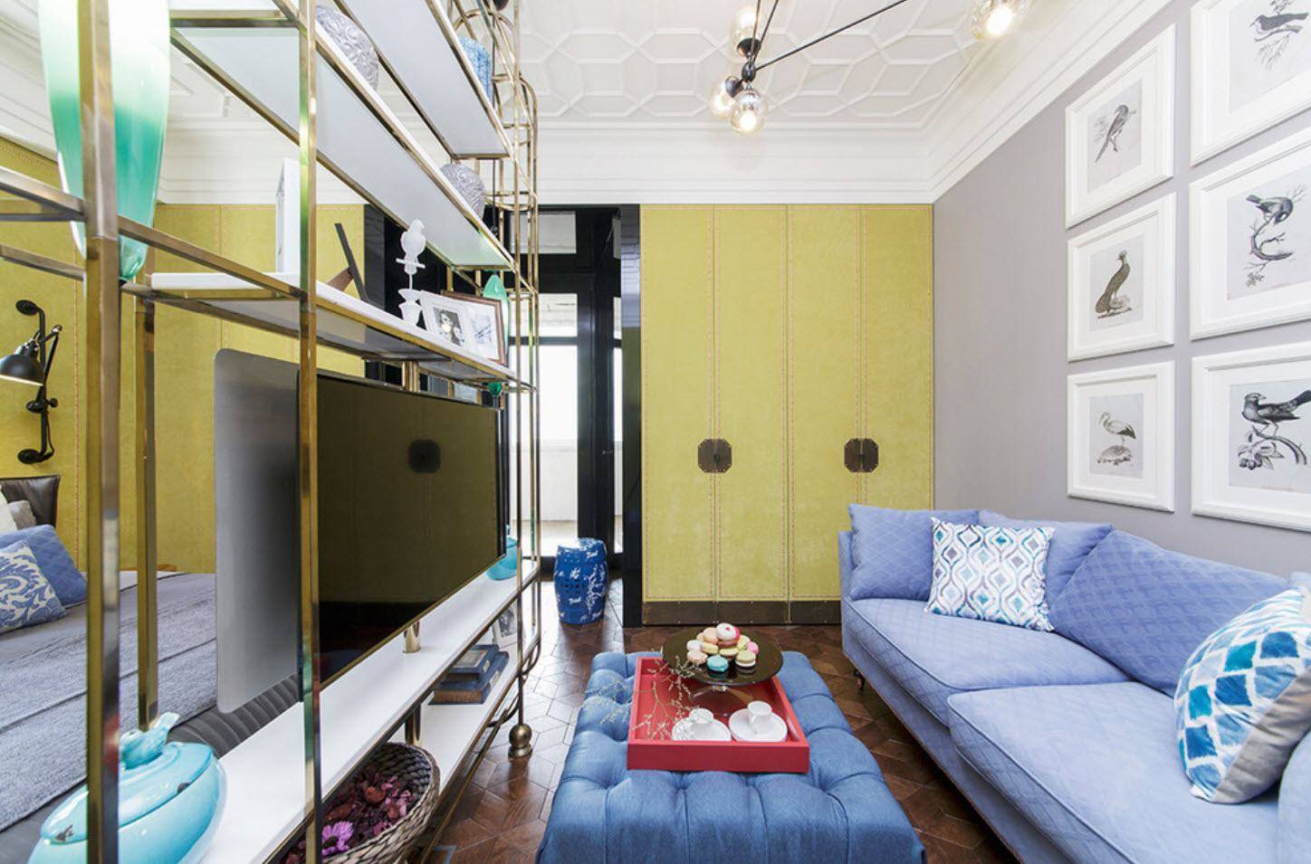 Небольшую квадратную комнату можно разделить на две зоны, используя высокие стеклянные перекрытия. Вдоль одной стены следует расположить кровать и отделить ее от углового дивана со стеклянным кофейным столиком с помощью переносных перегородок. Такой интерьер можно оформить в нежно-зеленых тонах, разбавленных яркими акцентами фиолетового и карамельного цветов.