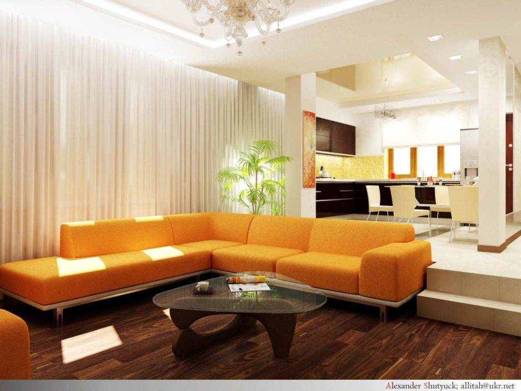 - во-первых, высоты потолков и площади объединенного помещения должно быть достаточно для создания подиума. В противном случае все это будет смотреться нелепо, так как для работы на кухне или отдыха в гостиной не хватит свободного места;