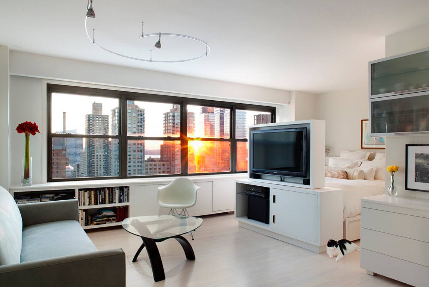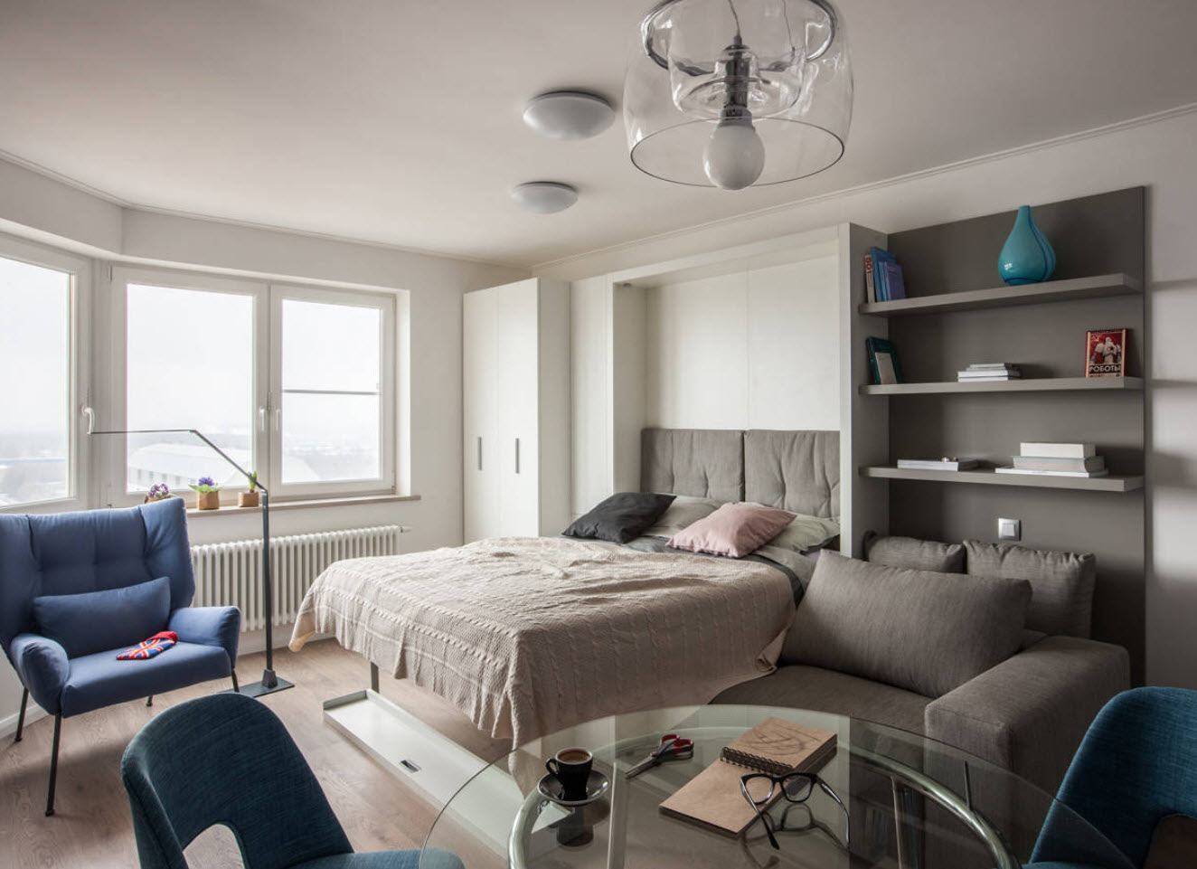 Продумывая интерьер для гостиной и спальни в одной комнате, люди выбирают минималистичный стиль, фото таких комнат наглядно показывают, как будет смотреться такая комната.