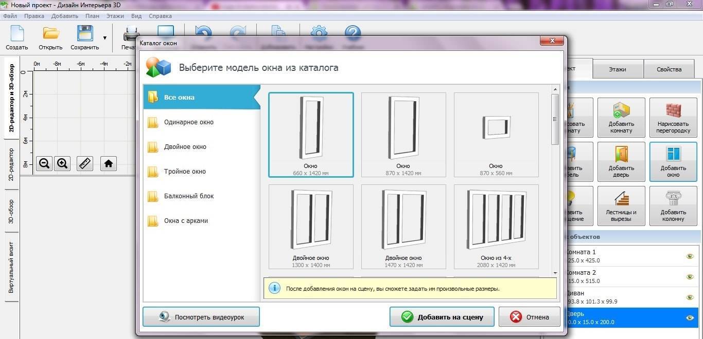 При составлении плана помещения учтите: толщину стен, размеры окон, места подведения коммуникаций. Все их свойства можно исправлять и позже (см. список объектов в левой части окна)