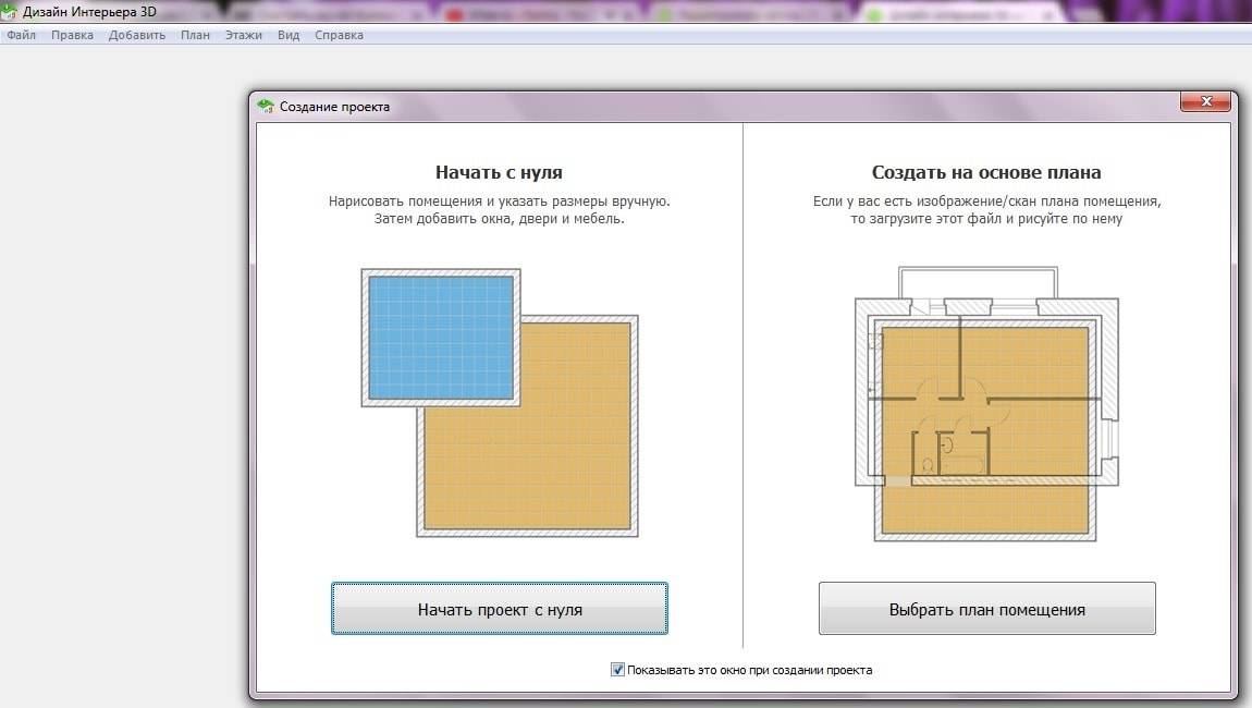 ![]() | Выбрав вкладку «Создать проект», появиться диалоговое окно, предлагающее два варианта. Первый («Начать с нуля») — предполагает создание помещений самостоятельно с указанием размеров вручную. Второй («Создать на основе плана») — позволяет загрузить готовое изображение планировки. |