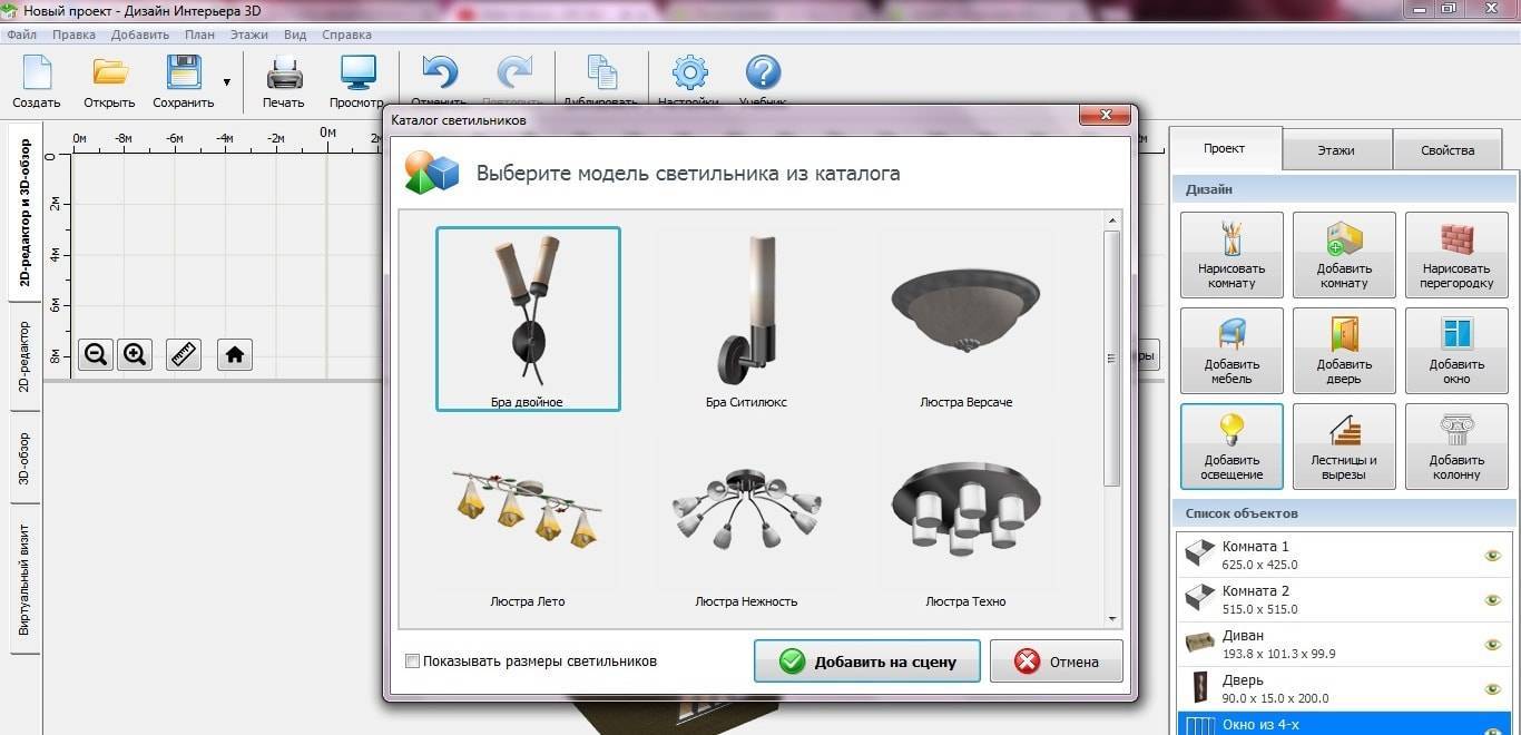 ![]() | Пункт «Добавить освещение» позволяет подобрать модель светильника из каталога. |