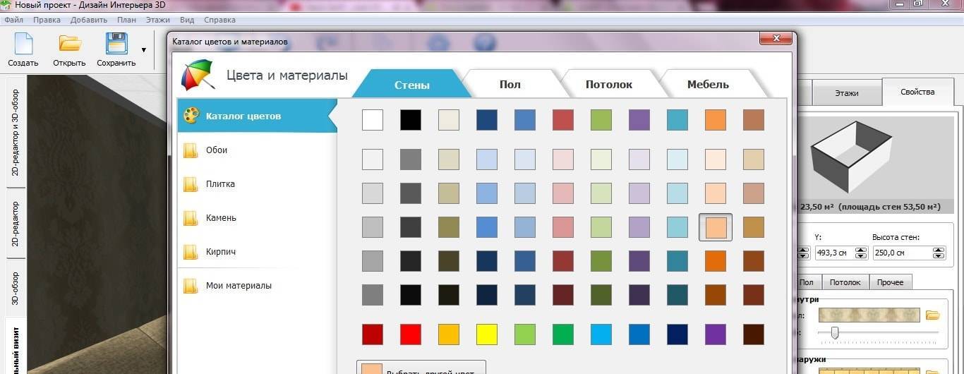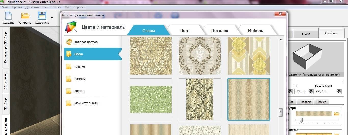 ![]() | На данном этапе можно поэкспериментировать с оформлением стен, пола и потолка. Есть возможность выбрать обои из каталога либо загрузить свои образцы. |