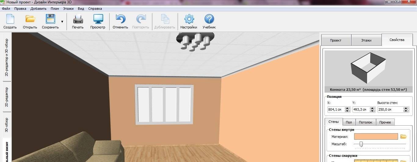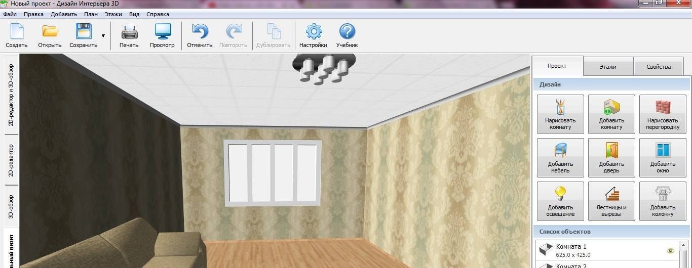 Дизайнерские программы с расширенным функционалом предпочтительнее, так как дают возможность управления объектами, что в свою очередь позволяет подыскивать им оптимальное месторасположение. В них можно вообще отказаться от стандартных предметов обстановки и заняться конструированием мебельных модулей, подборкой принтов и орнаментов для текстиля и обивки, рисунка обоев, текстуры стеновых панелей.