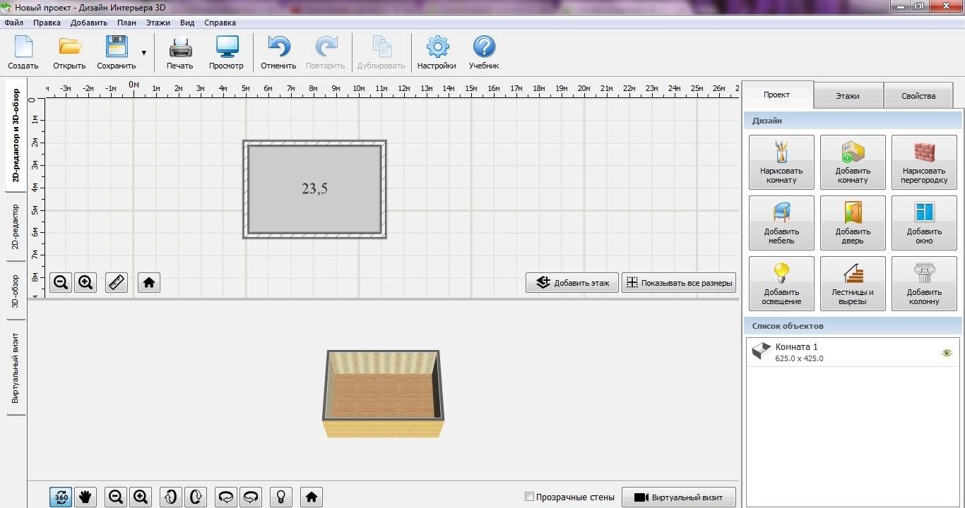 ![]() | Простыми движениями разграничиваем в 2D — редакторе контуры комнаты нужных размеров. При этом в нижнем окне можно одновременно видеть все манипуляции в режиме 3D — обзора. После отрисовки плана перейдем к рассмотрению возможностей интуитивного меню в правой верхней области окна программы. |
