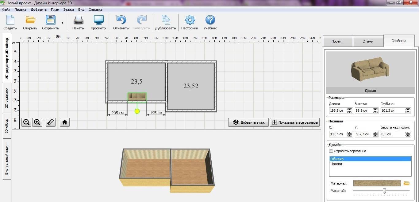 ![]() | Выделив установленный диван и открыв вкладку «Свойства» можно скорректировать базовые размеры, позицию, обивку и цвет. |