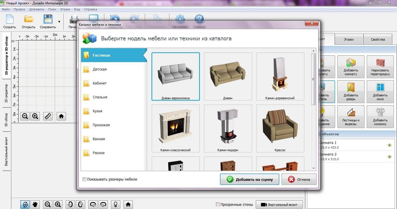 ![]() | Следующий пункт меню — «Добавить мебель». В появившемся списке содержаться основные позиции для гостиной, детской, кабинета, спальни, кухни, прихожей и ванной. Выбираем соответствующий предмет мебели и располагаем в нужном месте помещения. |