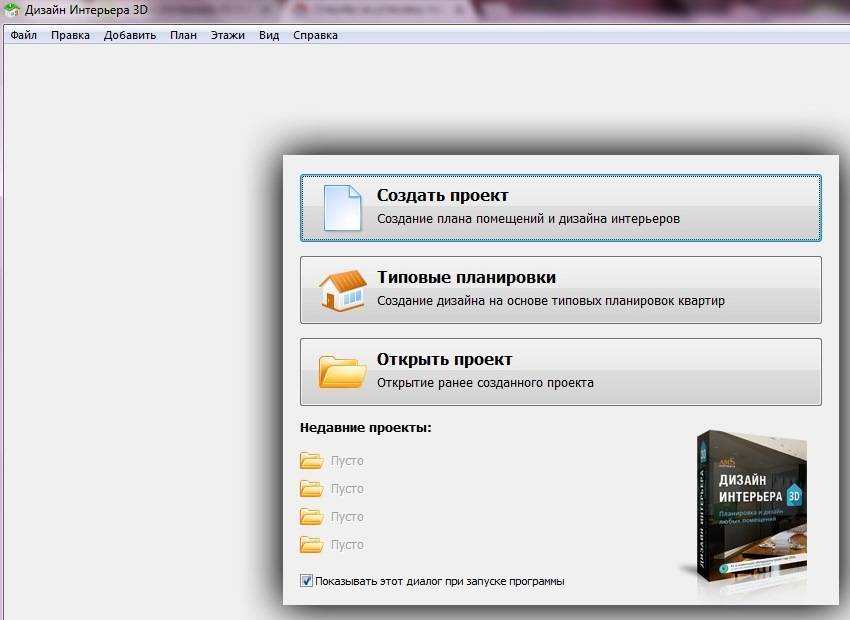 ![]() | Первое, что вы увидите при запуске программы — диалоговое окно с возможностью выбрать тип проекта. Можно использовать типовые планировки или создать проект самостоятельно. |