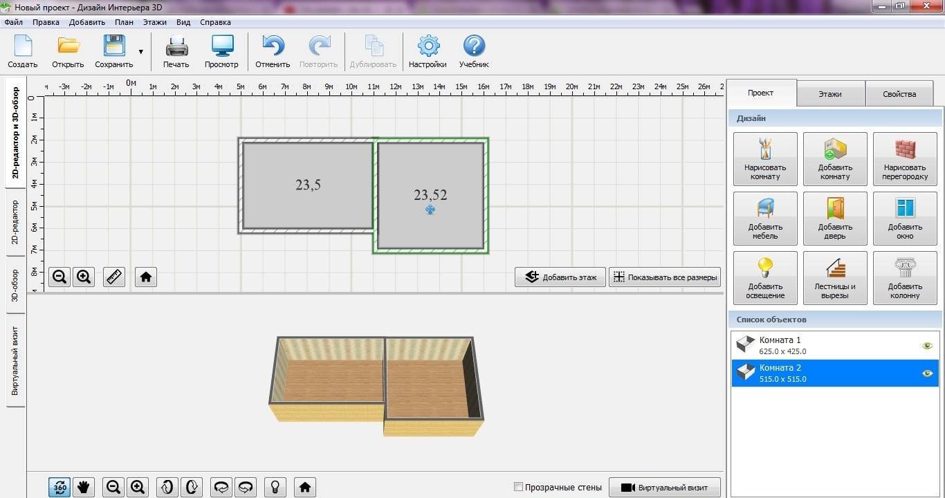 ![]() | При желании, изменяем размеры добавленной комнаты на те, которые необходимы. Для этого в «Списке объектов» выбирается соответствующая комната и редактируется. |
