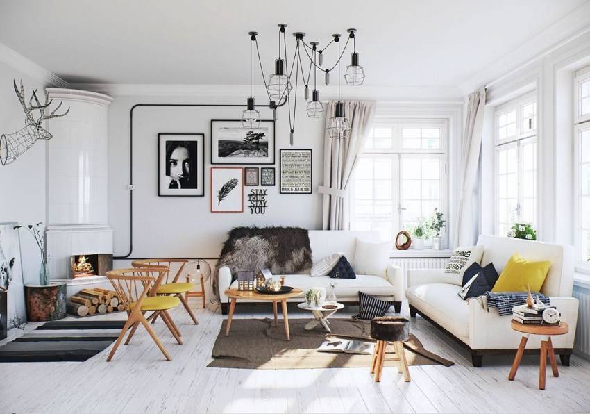 Завершает наш обзор стилей миниатюрных гостиных оформление в скандинавском духе. Для него характерны белоснежные фоновые элементы, которые только в единичных местах дополняются бежевыми или сочными акцентами.