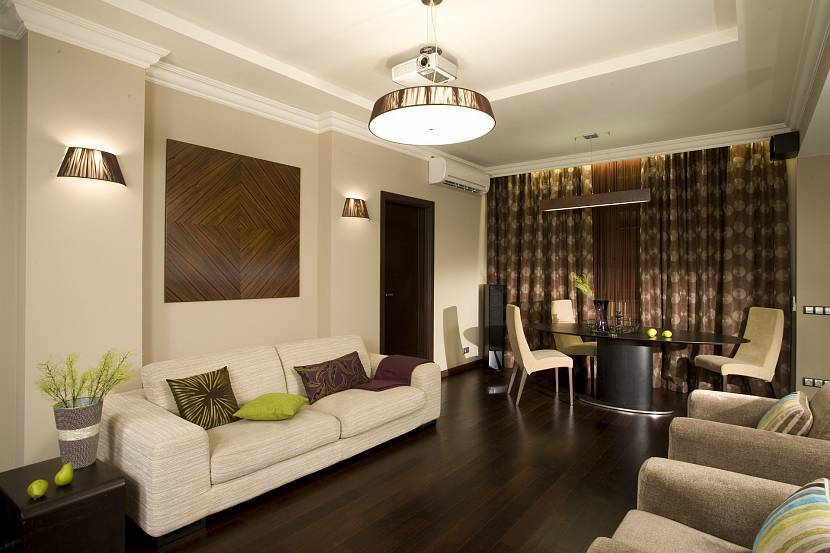 Трудно дать универсальный совет, какой оттенок или цветовое сочетание использовать в интерьере гостиной. Каждый из нас обладает собственными предпочтениями и вкусом. Универсальными считаются натуральные оттенки бежевого, коричневого, серого и зеленого цветов. Но не стоит все от стен до мебели выполнять в одной цветовой гамме.