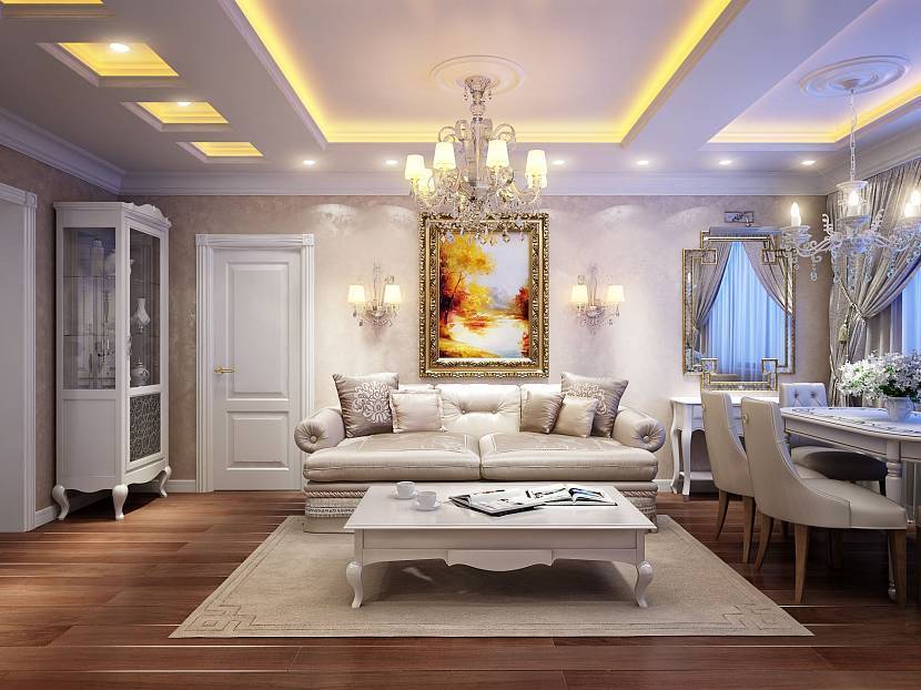 Если общая площадь гостиной составляет 12 и 15 кв м, она уже достаточна для отделки в классическом стиле. Подобное решение означает симметричность всей обстановки, гармоничность и легкость. Никаких напористых включений не должно быть, зато можно позволить себе употребить побольше белых тонов, использовать хрустальные светильники и позолоченные зеркала.