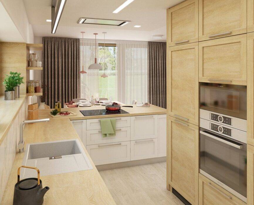 Интерьер кухни-гостиной в частном доме не заканчивается выбором мебели и текстиля. Важна форма будущей кухни в сочетании с гостиной