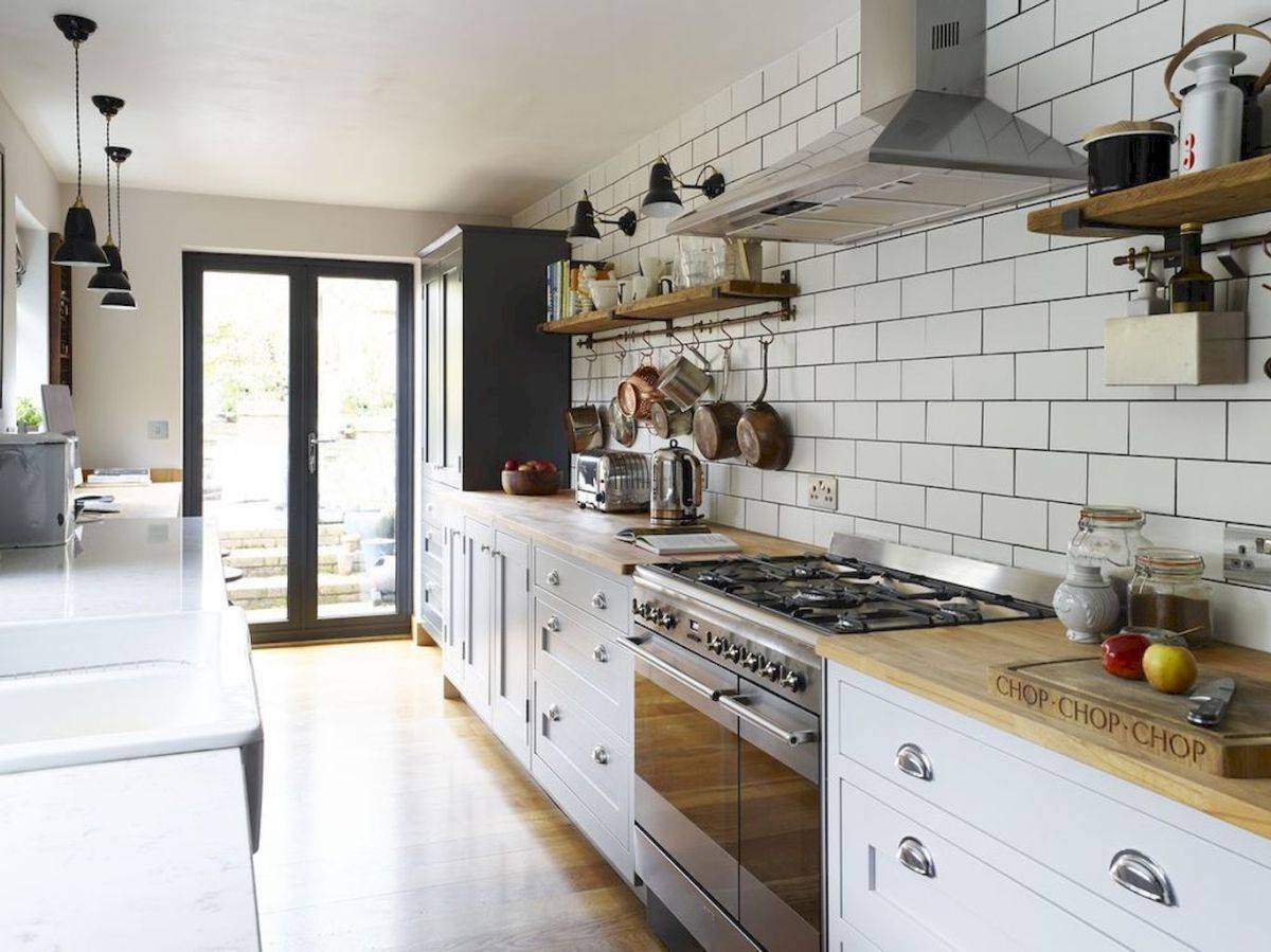 Пеналы, которые тянутся до самого потолка станут отличным дополнением для узкой кухни и местом для хранения кухонной утвари.