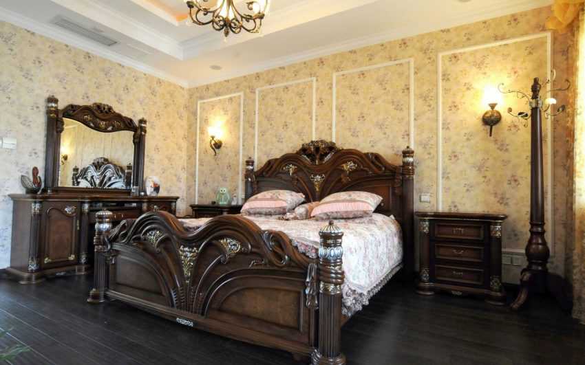 - исторических стилей витиеватую (с вензелями, к примеру), неправильной формы спинку. Она, выполненная в серебре, бордо или золоте, подчеркнет роскошь спальни, шик и претенциозность, передаст полное соответствие старинной эпохи;