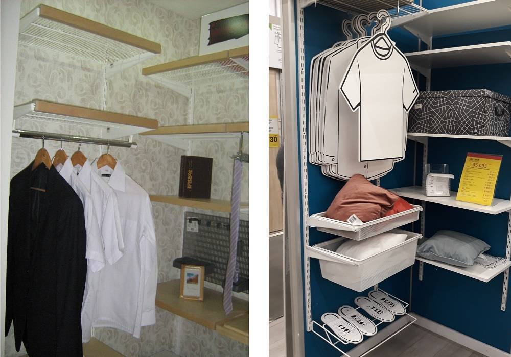 Расширить пространство жилого помещения возможно продумав дизайн кладовки-гардеробной. Сплошные ряды стеллажей заменяются протянутыми от стены до стены штангами, на которых развешивается на плечиках одежда. Целесообразно оставить лишь несколько полок под самым потолком. Внизу, под вешалками с одеждой, хранится обувь на специальных наклонных полочках. Помещение должно быть хорошо освещено, дополнительно оборудуется зеркалом. Если позволяет метраж — ставится пуфик, на нем удобно примерять обувь.