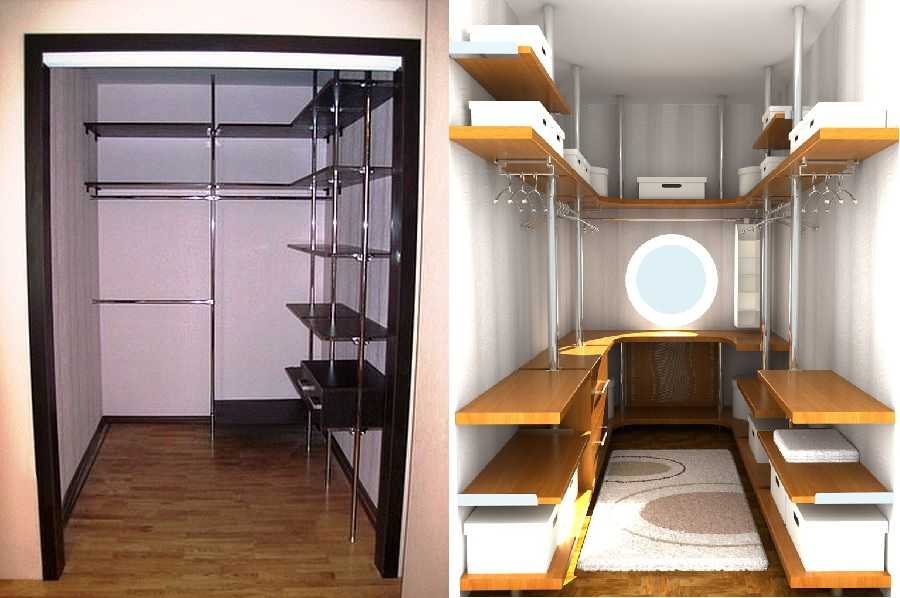 В брежневке размеры позволяют оформить полноценную комнату с различными типами стеллажей, навесными штангами, ростовыми зеркалами.