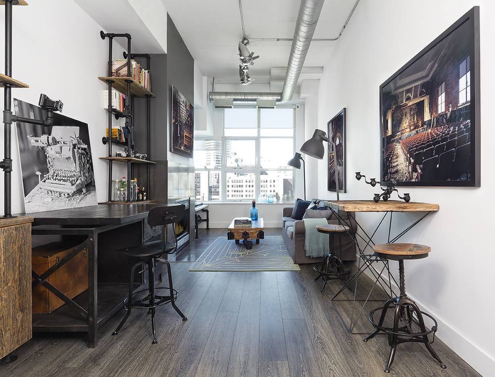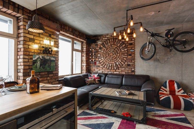 Интерьер, оформленный в стиле лофт предполагает наличие современной техники и поверхностей без чистовой отделки (бетонная стена, открытая кирпичная кладка, оголенные коммуникации).