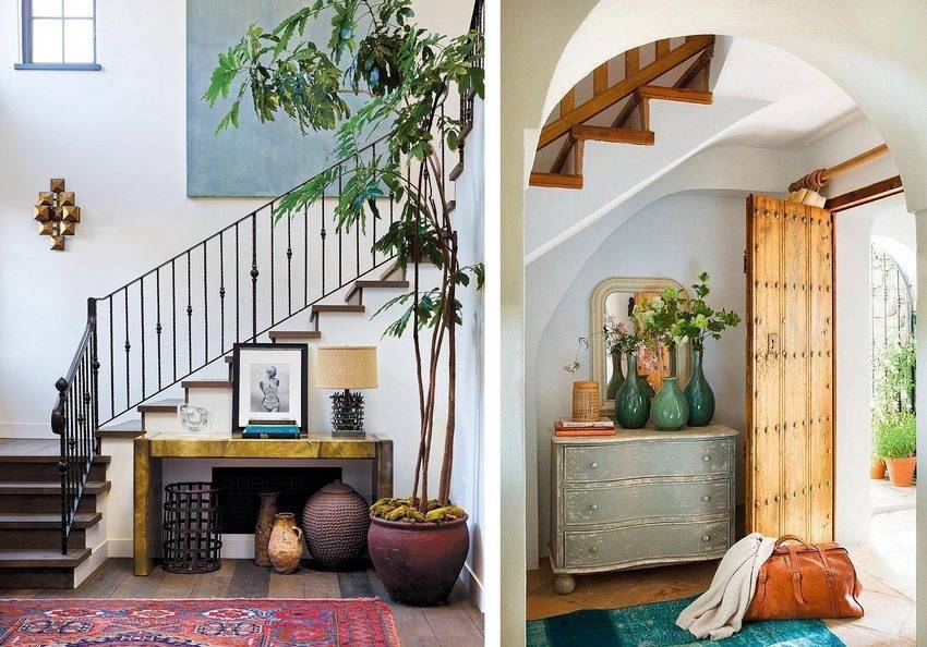 В частных домах прихожие нередко изобилуют пространством, потому здесь можно обустроить «зеленый уголок» – поставить горшки с живыми цветами. Растения, вне всякого сомнения, украшают входную зону и оживляют интерьер. В качестве альтернативы можно использовать композиции из искусственных цветов, закругленных в спирали веток или статуэток.