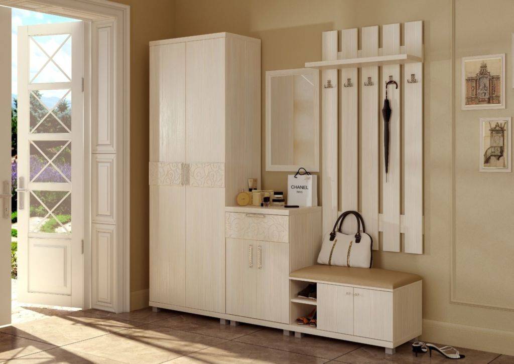 Светлый шкаф, зеркало, вешалка, тумба в прихожую с сиденьем и полками для обуви
