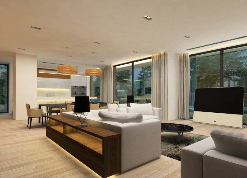 Дизайн-проект интерьера загородного дома составляется таким образом, чтобы гостиная находилась в центральной части коттеджа. Эта комната является его сердцем. При этом гостиная может быть совмещена со столовой или просторным холлом. При такой планировке создается впечатление простора и появляются возможности для интересного оформления интерьера. Дополнить такую гостиную можно каминной конструкцией, где будет создана уютная обстановка для общения и совместного времяпрепровождения.