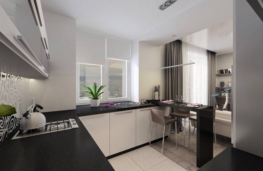 - Балкон. Если вы приобрели кухню с выходом на балкон, то есть два способа, как это обыграть. Первый – демонтаж окна и двери. Из оставшейся стенки делают барную стойку. Второй дизайн включает объединение кухни с балконом. Это достаточно дорого, но позволит расширить пространство.